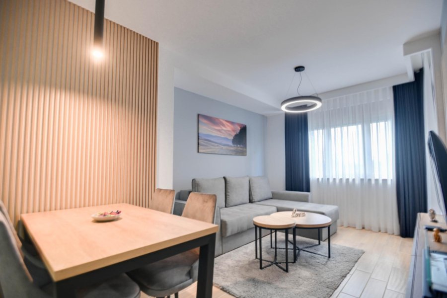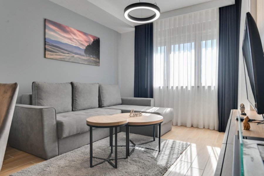 Apartman se sastoji od predsoblja, dnevnog boravka, dve spavaće sobe, kupatila, kuhinje i terase. Kuhinja je potpuno opremljena i uključuje ugradni šporet sa rernom, frižider, kao i posuđe i pribor za ručavanje.